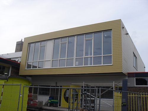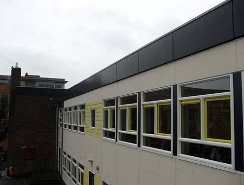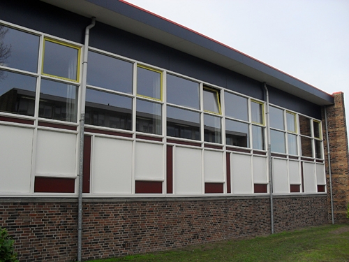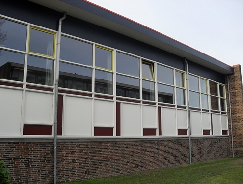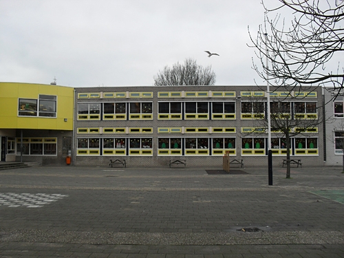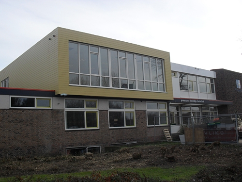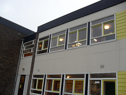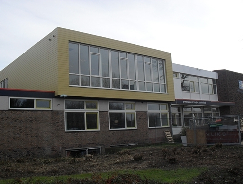 Het bestuur van het Protestants Christelijk onderwijs te Katwijk gaf opdracht om de basisschool te renoveren. In een speelse kleurencombinatie geel en wit uitgevoerd.