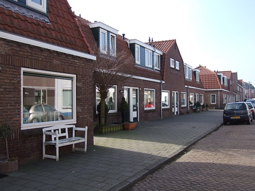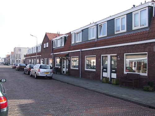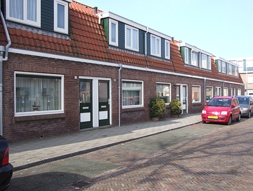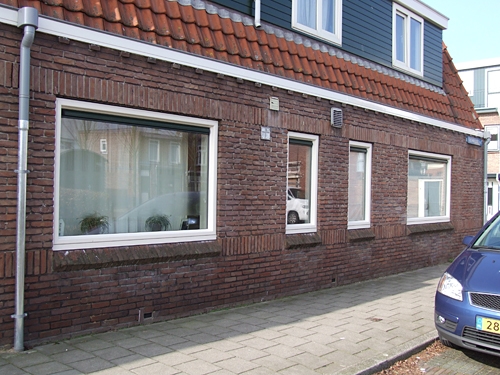 Hierbij is een gehele straat gerenoveerd waarbij de kozijnen en deuren in kunststof zijn uitgevoerd. De kleuren cremewit en spargroen vormden de basis.